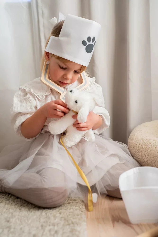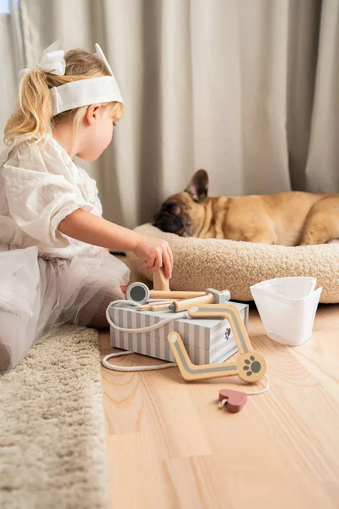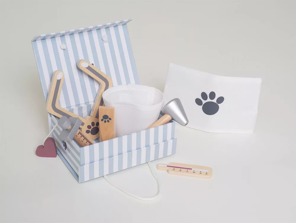 Készen állsz, hogy elindítsd a saját állatorvosi rendelődet? Ez a Jabadabado mágneses záródású, mindennel felszerelt állatorvosi táska minden megfelelő fa eszközt tartalmaz, hogy megmentsd a rászoruló szeretett állatokat és plüssállatokat.