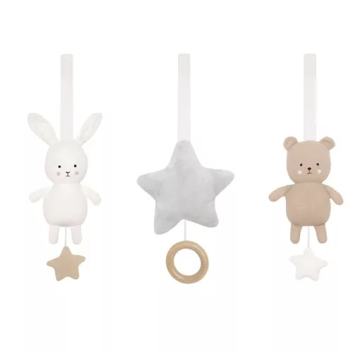 Imádnivaló puha babatornáztató játékok, egy csillag, egy nyuszi és egy mackó kombinációja. A csillag lágy altatódalt játszik. A hívogató formák és színek szórakoztatják a babát, és ösztönzik a vizuális és motorikus képességek fejlődését. A játékok hosszú akasztókkal rendelkeznek, hogy könnyedén rögzíthesd őket a babatornáztatóra, a kiságyba, babahordozóba vagy a babakocsiba.