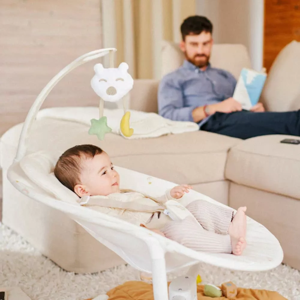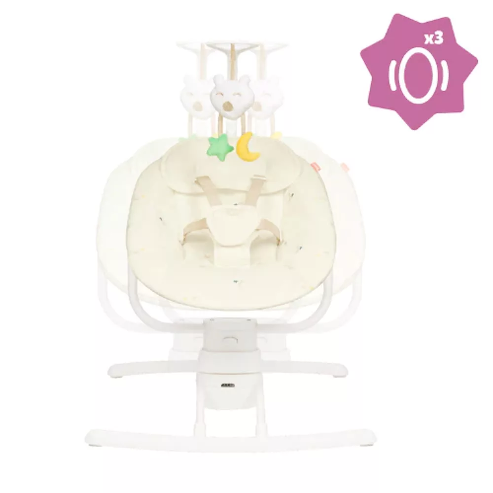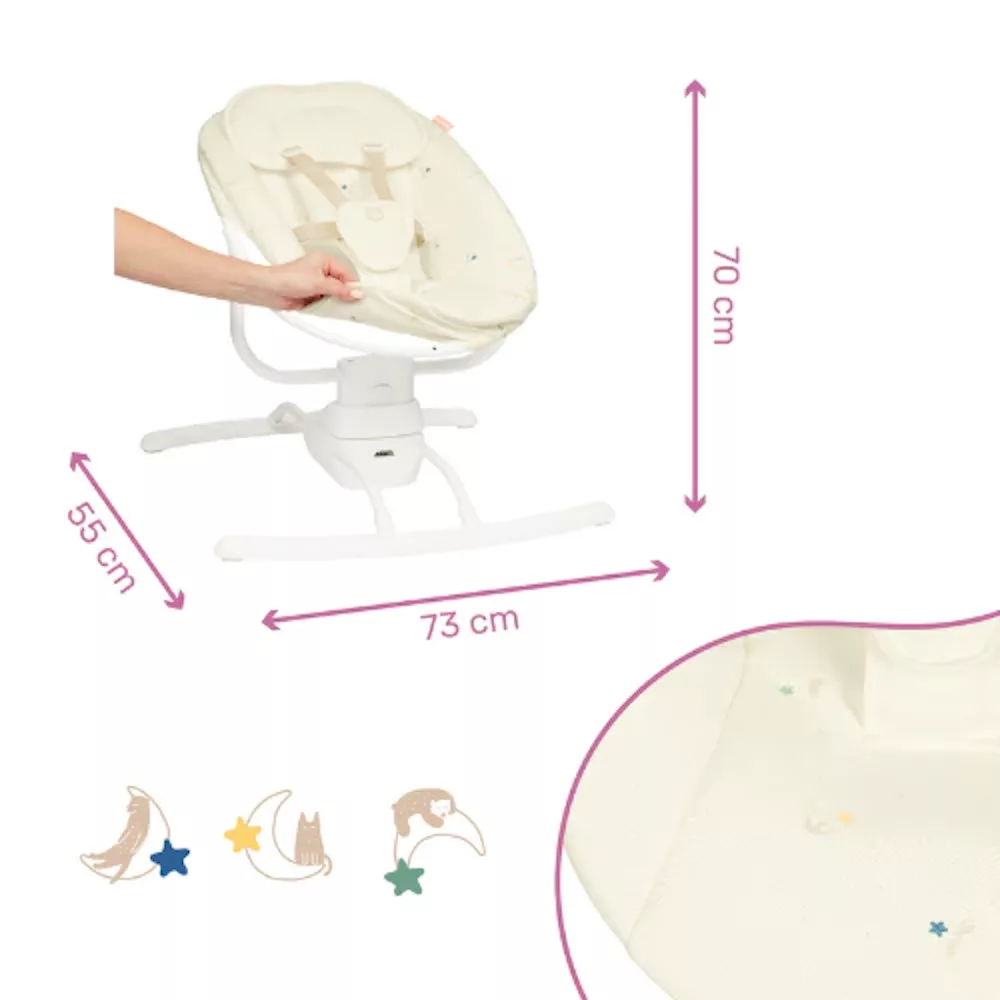 Reprodukálja a szülõk karjainak nyugtató mozgását!Fejtámasza és az újszülöttek hátához igazodó formája rendkívül kényelmessé teszi ezt a hintát, ideális egy pillanatnyi pihenéshez vagy ébredéshez, születéstõl kezdve :)Akár megnyugtatja, ringatja vagy játszik babájával, a hinta 3 oldalirányú lengési sebességet kínál. Több pozícióba állítható játékív, amely elõsegíti a baba felébresztését. 5 pontos biztonsági övvel felszerelt, a baba így teljes biztonságban tud játszani.A motoros hinta lágy dallamokat is játszik, 8 altatódalt tartalmaz állítható hangerõvel!Minden enteriõrbe tervezett csinos, trendi krémszínû huzata tökéletesen illeszkedik otthonába. És mivel tudjuk, hogy a kis regurgitációs balesetek gyorsan történnek, huzata levehetõ és mosógépben mosható.- elektromos hinta: reprodukálja a szülõk karjainak természetes mozgását- 3 oldalirányú lengési sebesség- kényelmes: beépített fejtámasz és az újszülöttek hátához igazított ülésforma- Játékív, hogy felkeltse a baba kíváncsiságát- 8 altatódal és 5 pontos biztonsági övMérete: 70 x 55 x 73 cmAnyagösszetétel: poliészter és fémÜléshuzata levehetõ és 30°-on mosógépben moshatóA hinta 4db LR14-es (C, baby elem) elemmel vagy hálózatról is mûködik (adapter és elem nincs mellékelve)Újszülött kortól, legfeljebb 9kg-os testsúlyig ajánlott