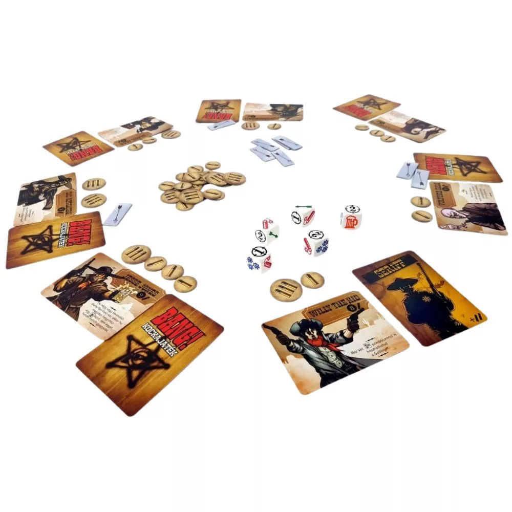 A Bang! kockajáték is kitűnően visszaadja a kártyajáték velős hangulatát. A játék elején minden játékos felvesz egy szereplőkártyát, amellyel titokban kialakulnak a csapatok: a seriff és helyettesei, a törvényen kívűliek és a renegátok. A seriff a banditákra vadászik, a banditák a seriffre, a renegátok pedig csak utolsóként akarnak életben maradni. A helyettesek védik a főnöküket, és persze az elmaradhatatlan golyózápor is állandó kelléke a játéknak!