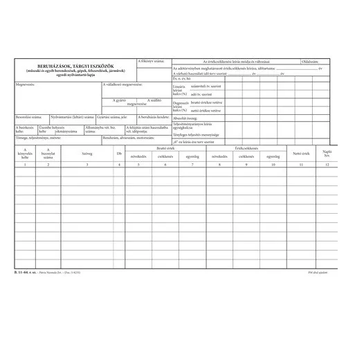 • beruházások, tárgyi eszközök (műszaki és egyéb berendezések, gépek, felszerelések, járművek) egyedi nyilvántartására szolgáló nyomtatvány