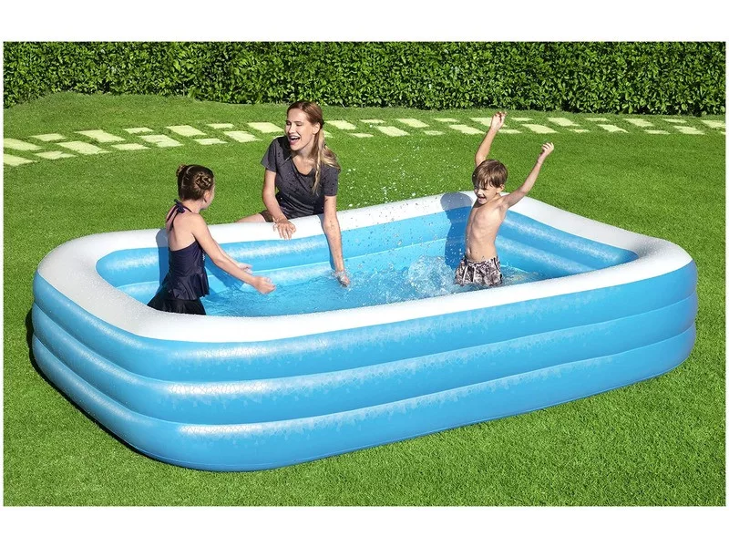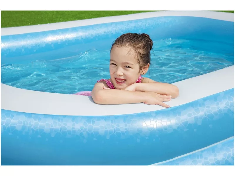 A Szögletes medence akár két felnőttnek és gyereknek is jó a pancsoláshoz a nagy melegben. A nagy medence több kamrás, biztonsági szeleppel van felszerelve, könnyen felfújható és leereszthető. A medence erős PVC-ből készült, nagyon tartós, ellenáll az időjárásnak. A készlet egy erős, öntapadó javítófoltot is tartalmaz. Felfújt méretek: 262 x 175 x 51 cm.