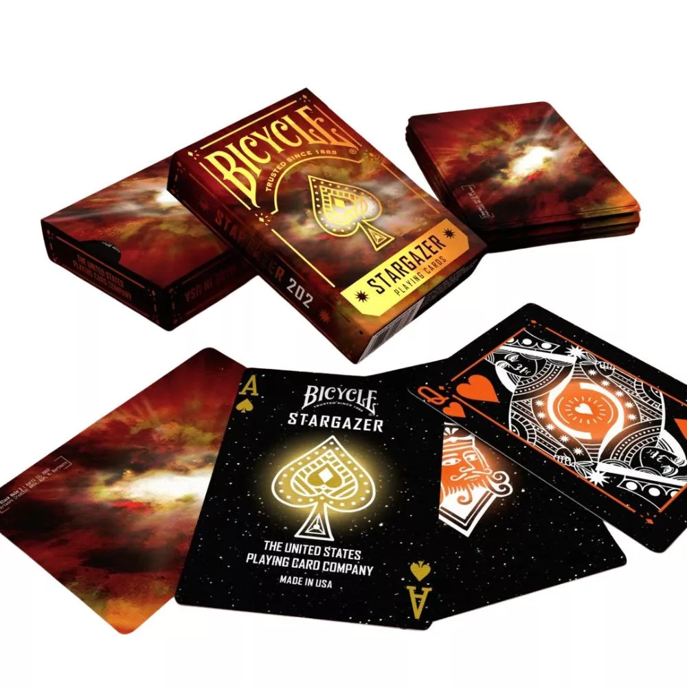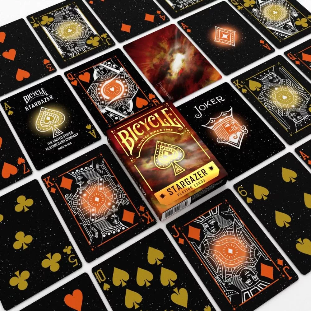 A csillagok sosem alszanak – most te is a fényükben játszhatsz. A Bicycle Stargazer 202 francia kártya a kozmosz forró szívét hozza el az asztalodra, ahol a napkitörések ragyogása és a sötét égbolt mélysége találkozik. Ez a pakli a csillagrobbanások energiáját zárja magába – minden lap egy apró, lüktető univerzum.