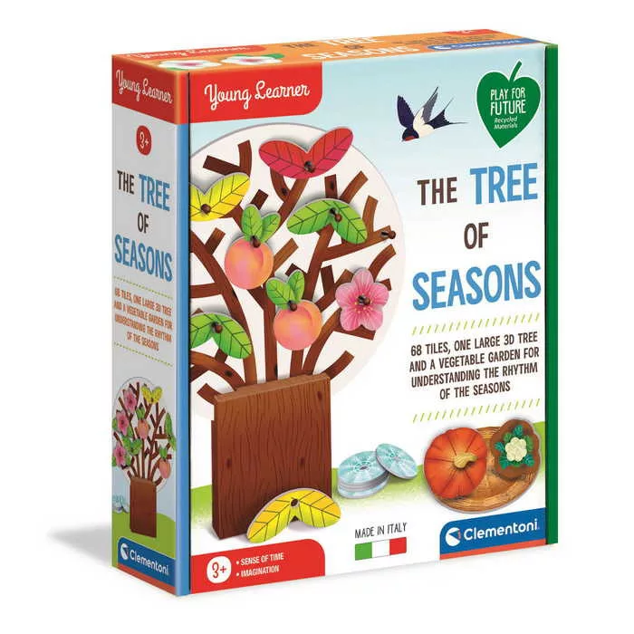A dobozban található nagy kartonfát gyermeked felöltöztetheti az adott évszaknak megfelelően: hópelyhekkel, levelekkel, virágokkal és őszibarackkal, attól az évszaktól függően, amelyiket szeretné bemutatni.