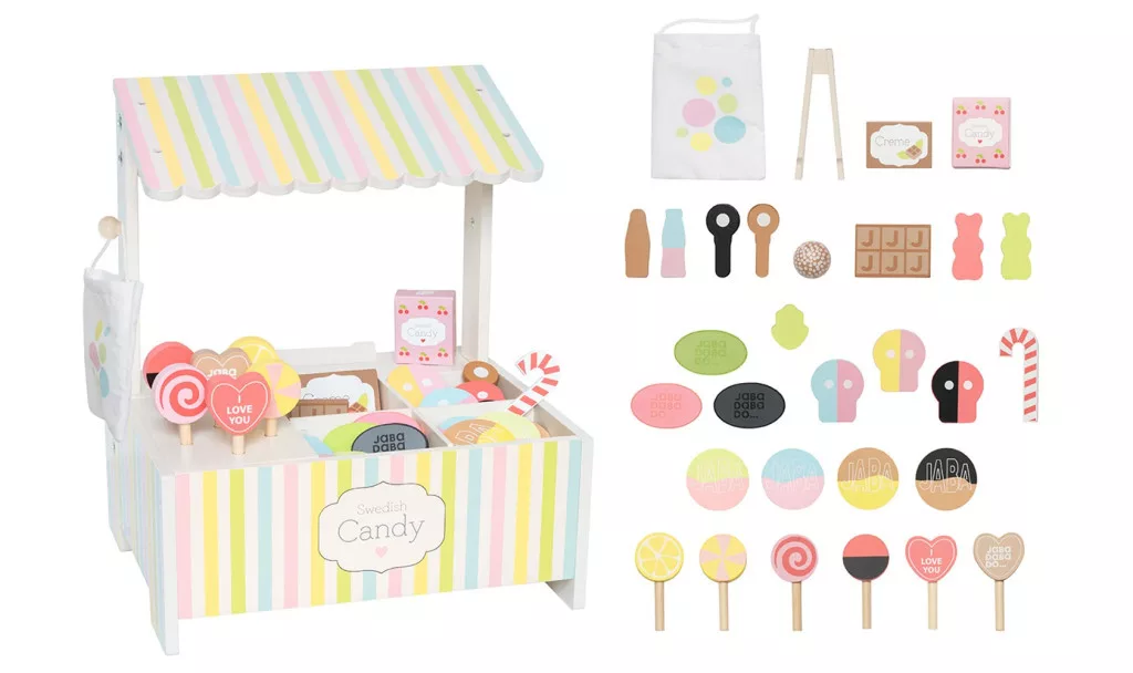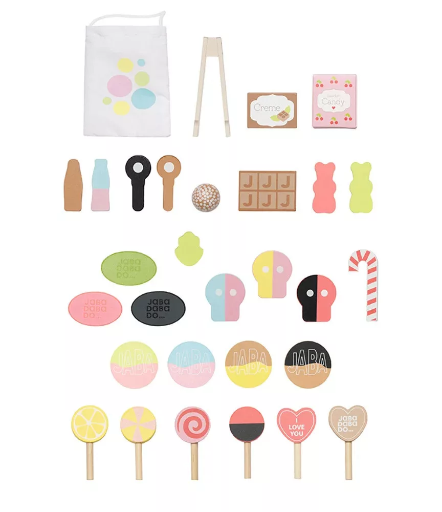 Ez a csodálatos, fából készült cukorkás stand tökéletes kiegészítő azoknak a gyerekeknek, akik szeretnek boltosat játszani és eladni. A készlet az áruk kedves keverékét tartalmazza, különböző édességek formájában, mindez gyönyörű pasztell színekben. A készlethez tartozik egy kis szövetszatyor is, amibe a vásárlók válogathatnak, vagy amiben magukkal vihetik a megvásárolt termékeket. A gyerekek vígan gyakorolhatják a vásárlást, az eladást és az árképzést. Tökéletes a fantáziadús játékhoz és a szociális és matematikai készségek fejlesztéséhez!