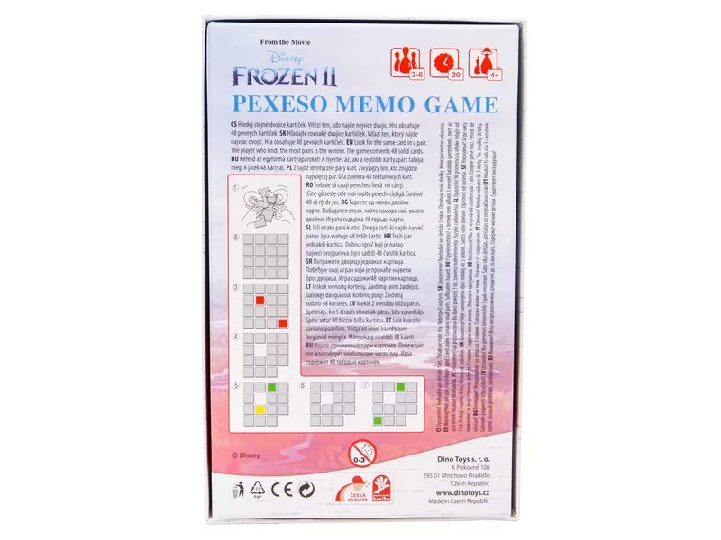 A Dino Jégvarázs II memóriajátékban a gyerekek kedvenc szereplőik – többek között Anna, Elsa, Olaf és Sven – képeit kereshetik párba fordítva a kártyákat. A klasszikus memóriajáték egyszerű szabályai miatt gyorsan megtanulható, mégis újrajátszható, így ideális közös családi program óvodás és kisiskolás gyerekekkel.​​