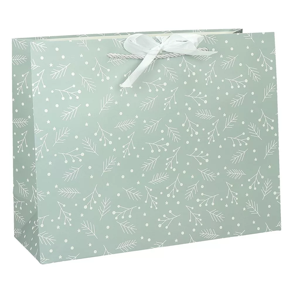 Dísztasak CREATIVE Deluxe Plus XL 45x33x10 cm fekvő fagyöngy matt világoszöld sodort füles masnival