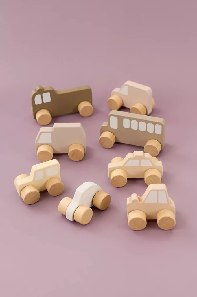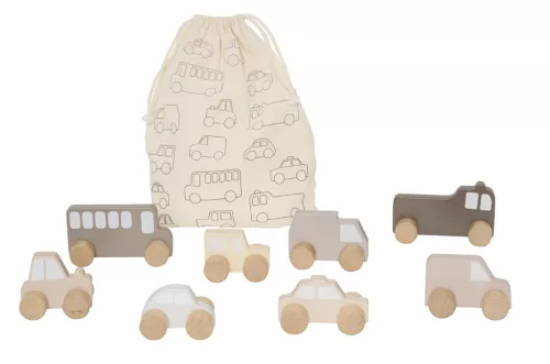 Aranyos kisautók a legkisebbeknek. Az autók masszív kerekekkel rendelkeznek, így könnyedén mozoghatók. A játékhoz 8 különböző jármű tartozik, amelyek egy szövetzsákba vannak csomagolva, így utazáskor is mindig magaddal viheted azokat.