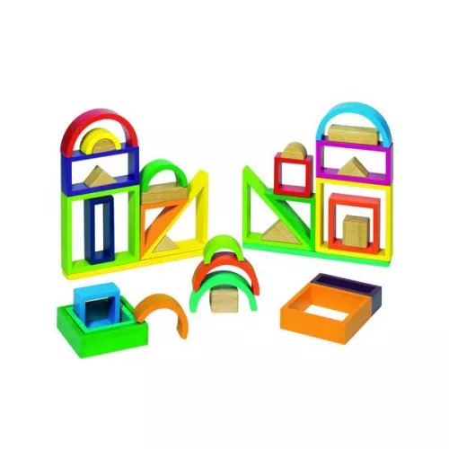 A GOKI Szivárványos építőkockái nem egy megszokott építőkocka készlet elemei. Mivel nem tömörek, ezért könnyűek, légiesek, és éppen ezért rengeteg érdekes dolgot építhetnek a gyerekek belőlük.