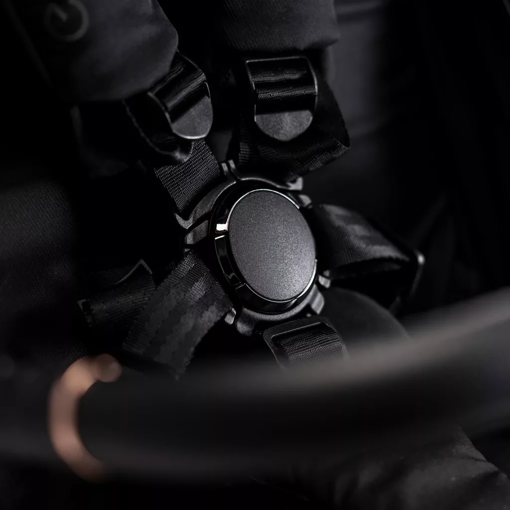 • Belső mágneses 5 pontos biztonsági öve, mely állítható magasságú és 360 fokban forgatható Eco bőrrel borított karfája meggátolja gyermeked kiesését