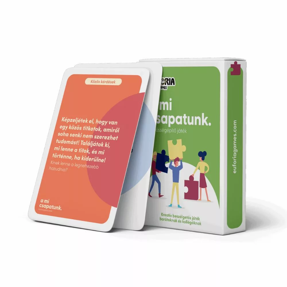 Erősítsd a csapatod játékosan! Az Eufória – a mi csapatunk egy közösségépítő kártyajáték, amely szórakoztató kérdésekkel és kihívásokkal segít megismerni egymást, fejleszti a bizalmat és a kommunikációt. Legyen szó munkahelyi csapatról, iskolai közösségről vagy baráti társaságról, ez a játék garantáltan közelebb hoz mindenkit egymáshoz – és közben rengeteg nevetést is hoz.