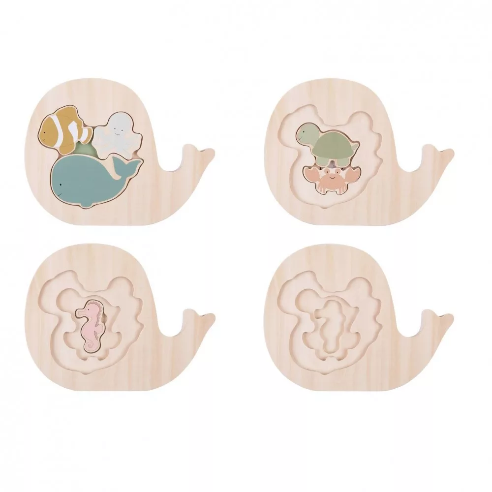 Szórakoztató állatos fa puzzle különböző egymásra épülő rétegekkel. Hat különböző óceáni állatfigura alkotja a kirakós darabokat. A figurák úgy lettek megtervezve, hogy a kis kezekbe is beleférjenek és könnyen megfoghatók legyenek.