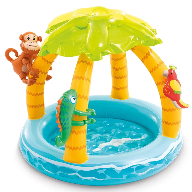 Tömör vinyl anyagból készült medence felfújható padlórésszel. Szórakoztató gyermekmedence trópusi sziget formájában.