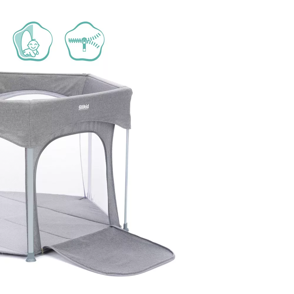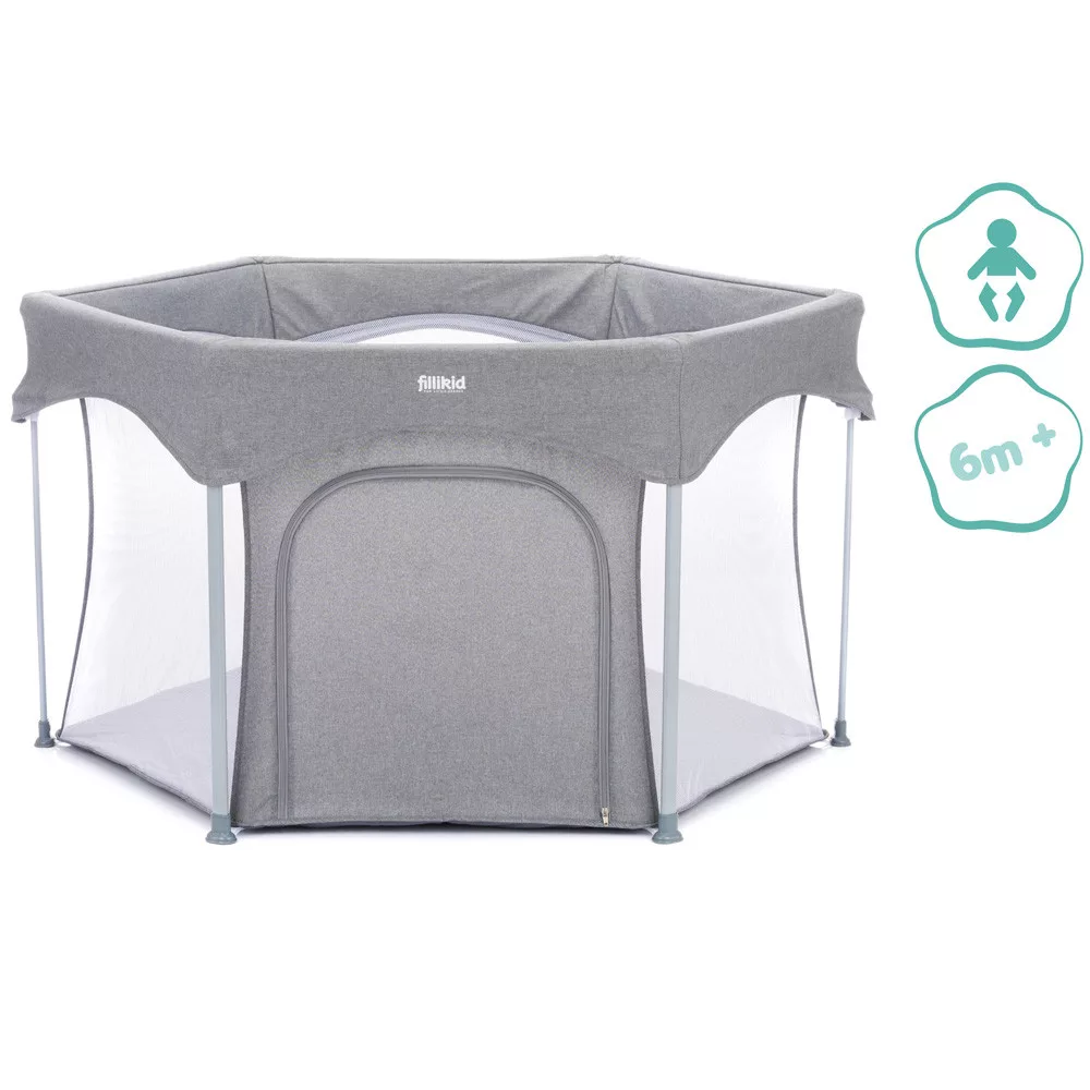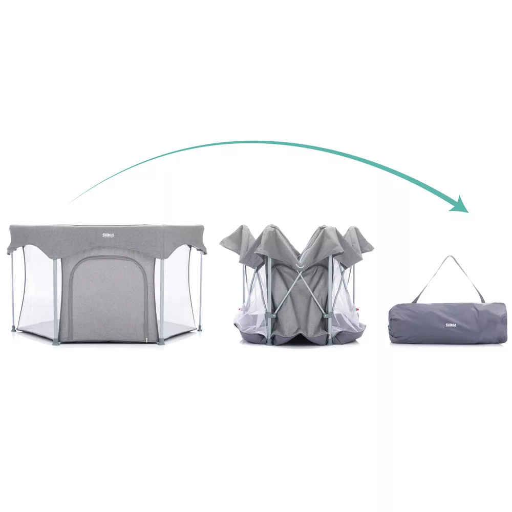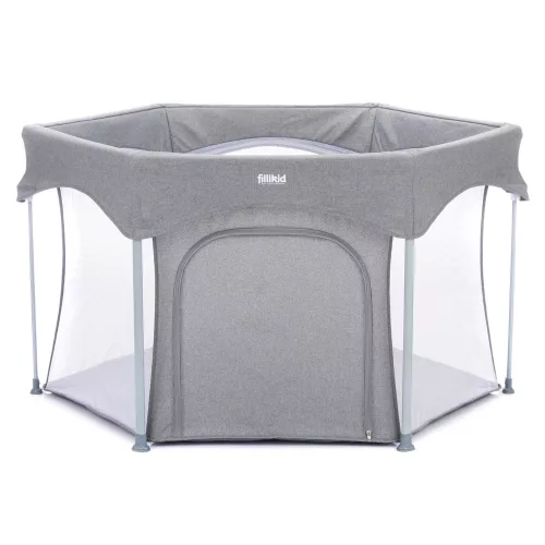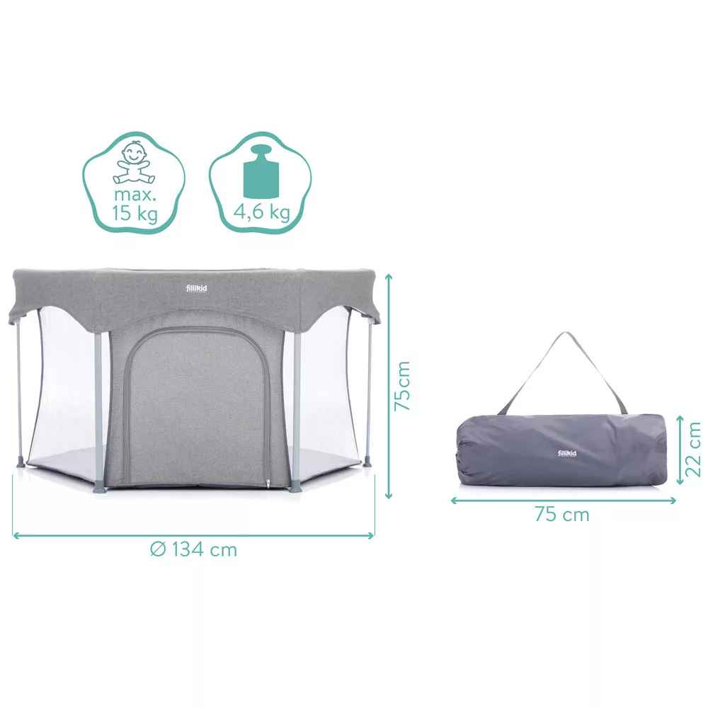A házban, lakásban gyakran vannak olyan veszélyes dolgok, amelyek mászkáláskor, sétáláskor veszélyt jelenthetnek az aktív babákra. Ez a Fillikid hatszögletû járóka nagyobb biztonságot nyújt kis kedvesének. A párnázott alap hangulatos játékfelületet és extra meleget biztosít a hideg járólap vagy parketta ellen. A járóka két egyszerû lépésben kinyitható és összecsukható. A szállítótáskával könnyedén összepakolhatod és magaddal viheted mindenhova, hogy babád mindig biztonságban tudjon benne játszani. A hálós oldalfalaknak köszönhetõen szemmel tarthatod babádat, és a levegõ keringhet a járókában. Oldalán cipzár található, így gyermeke felügyelet mellett önállóan tud ki- és bemászni.6 hónapos kortól ajánlott.Méret: - külsõ átmérõ: 134 cm- belsõ átmérõ: 120 cm- magasság: 67 cm- maximális terhelhetõsége: 15kg- csomagolási méretek hordtáskával: 22 cm x 20,5 cm x 75cmSúly: 4,6 kgKülön vásárolható a bele illõ járókabetét, mely még jobb párnázást biztosít a baba alatt:"Fillikid betét hatszögletû utazójárókába 124cm átmérõjû