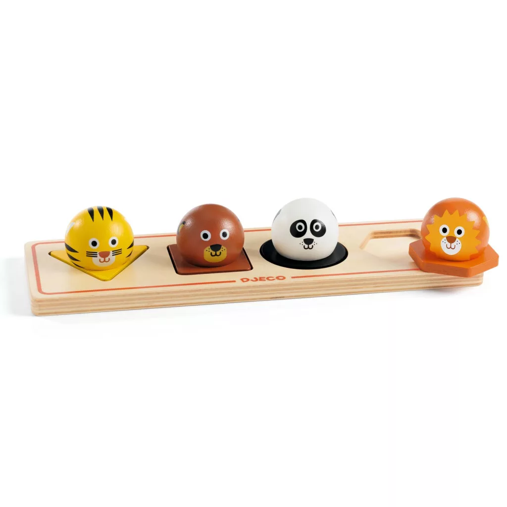 Az óriás állatfej gombok megkönnyítik a marokfogás és elengedés gyakorlását, az alapformába illesztést. A tigris, a barnamedve, a panda maci és az oroszlán várják, hogy az érdeklődő gyermekek felfedezzék a formák közötti különbséget, és a megfelelő formába passzítsák őket. Közben fejlődik a kéz-szem koordinációjuk.