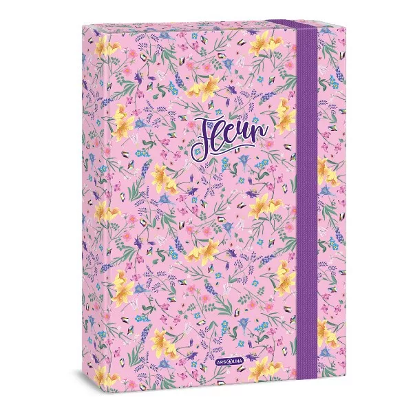 A/4 méretű füzetbox. Kemény, tartós kartonból, 4 cm-es gerinccel, fényes fóliával, 7 mm széles gumipánttal. Belseje egy színnel nyomott. Füzetek, iratok tárolására .