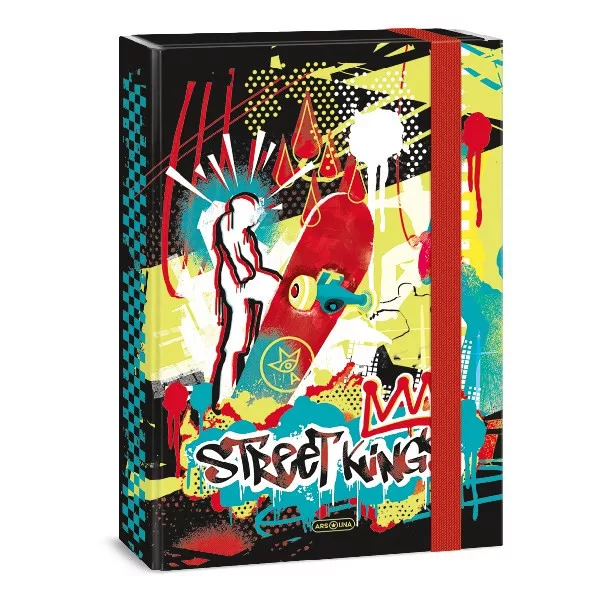 A/4 méretű füzetbox. Kemény, tartós kartonból, 4 cm-es gerinccel, fényes fóliával, 7 mm széles gumipánttal. Belseje egy színnel nyomott. Füzetek, iratok tárolására .