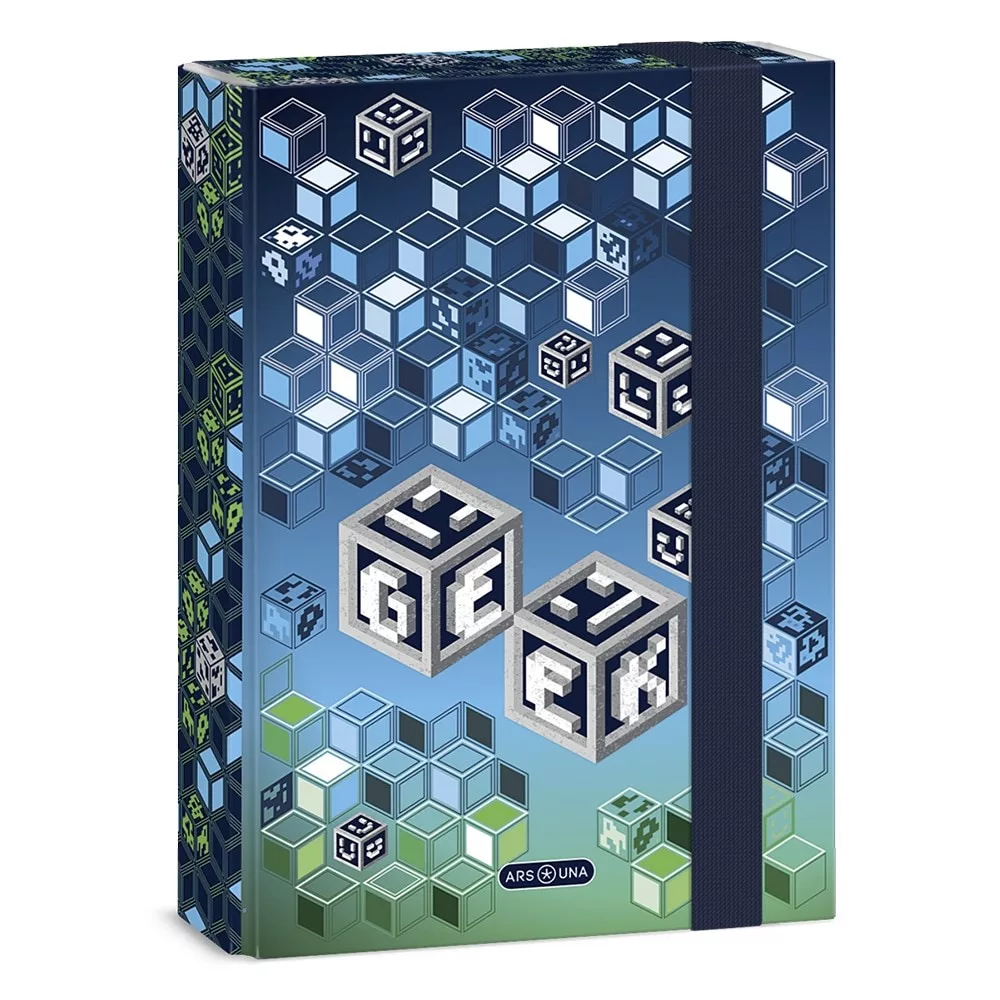 A/5 méretű füzetbox. Kemény, tartós kartonból, 4 cm-es gerinccel, fényes fóliával, 7 mm széles gumipánttal. Belseje egy színnel nyomott. Füzetek, iratok tárolására .