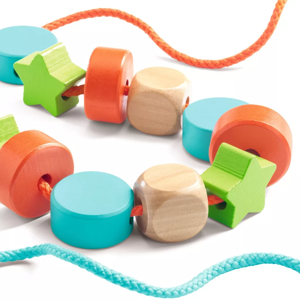 Alapformákat mintázó nagyméretű, fából készült gyöngyökből gyönyörű sorozatokat lehet felfűzni. Ez a szórakoztató tevékenység kézügyességet és koncentrációt igényel. Segíti a szem-kéz koordináció fejlődését. Tendkívül sokoldalúan használható.