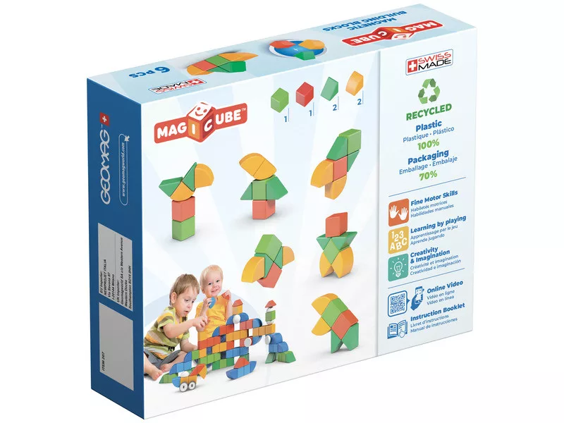 A Geomag Magicube Recycled kezdőszett 6 db-os kiszerelése az első lépés a mágneses építés világába és a környezettudatos játékhoz. Minden elem újrahasznosított műanyagból készült, és mágneses, így szabadon variálható, egymáshoz illeszthető formák, tornyok, építmények alkothatók már 1 éves kor felett.