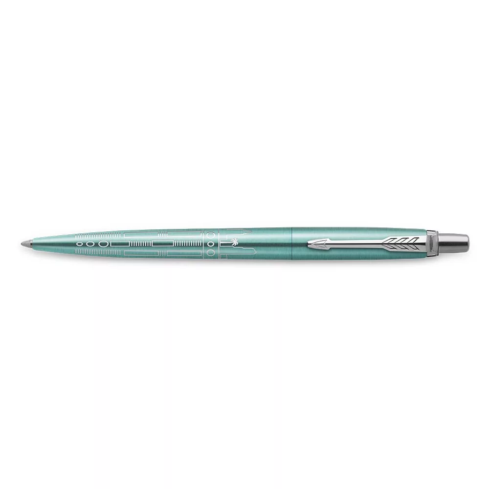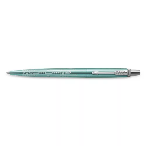 A Parker mesteri kivitelezésének lenyűgöző példájaként az egyedi dizájn precízen lézergravírozva jelenik meg a toll testén. A türkiz lakkozott felület, a sima írásélmény és a Jotterre jellemző ikonikus „kattanás” teszi teljessé ezt az elegáns tollat.