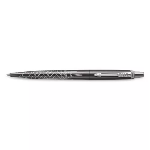 A Parker mesteri kivitelezésének lenyűgöző példájaként az egyedi dizájn precízen lézergravírozva jelenik meg a toll testén. A szürke lakkozott felület, a sima írásélmény és a Jotterre jellemző ikonikus „kattanás” teszi teljessé ezt az elegáns tollat.