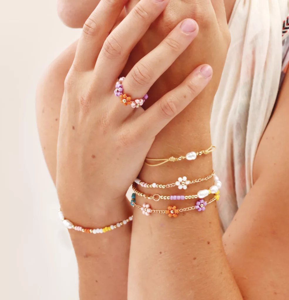 Ez a finom, elegáns ékszerkészítő készlet gyöngyház és arany színek harmonikus kombinációjával készült. A csomag segítségével karkötők és gyűrűk is készíthetők virágos és gyöngyös elemekből. A természetes hatású gyöngyök és a láncok különleges, nőies megjelenést adnak az ékszereknek. A kész darabok könnyed, nyári vagy elegáns szettekhez is jól illenek.