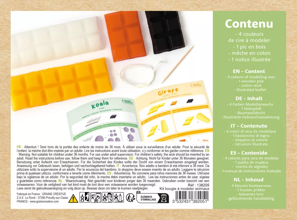 Ez a gyerekeknek készült készlet puha formázó viaszt tartalmaz, amely kézzel könnyen alakítható. A viaszt elég kissé felmelegíteni a tenyérben, így könnyen és biztonságosan formázhatók belőle kis állatfigurák. A színek keverhetők, így minden alkotás egyedi lehet. A figurák dekorációként vagy gyertyaként is használhatók.