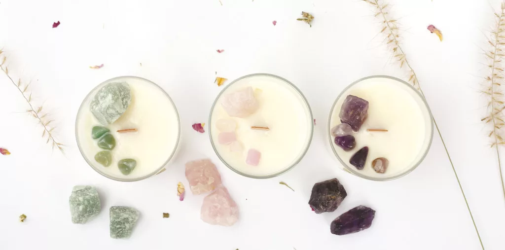Ezzel a készlettel egy dekoratív, ásványokkal díszített gyertya készíthető. A természetes kövek és a szójaviasz elegáns és harmonikus megjelenést adnak az alkotásnak. A patchouli illat különleges hangulatot teremt. A kész gyertya dekorációként vagy ajándékként is jól mutat.