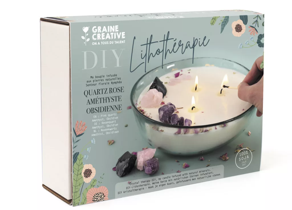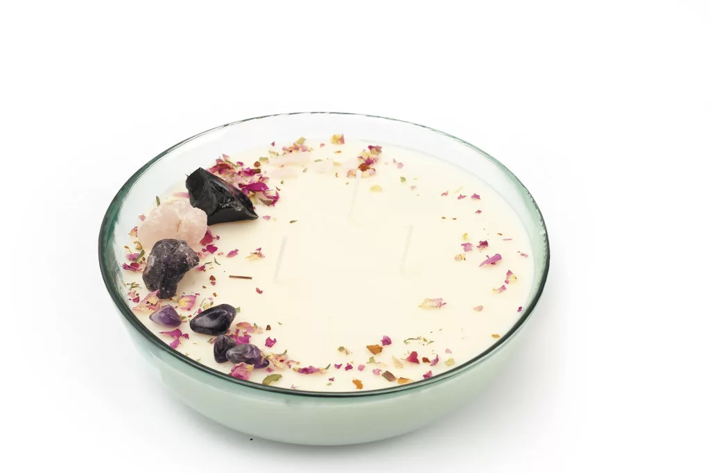 Ezzel a készlettel egy nagyméretű, több mint 70 órán át égő gyertya készíthető. A gyertya kristályokkal és szárított rózsaszirmokkal díszíthető, ami elegáns megjelenést ad neki. A különböző ásványok különleges hangulatot teremtenek az otthonban. A nagy üveg tégelyben készült gyertya látványos dekoráció lehet.
