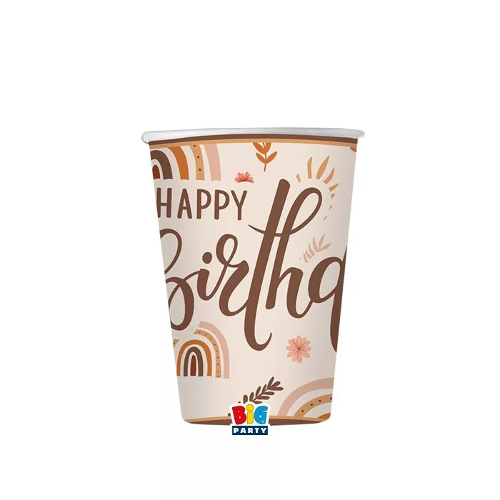 8 db 250 ml-es papír pohár Happy Birthday felirattal, bohém stílusú mintával.