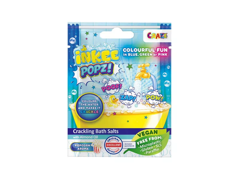 • Inkee Popz pattogó fürdősó különleges popcorn aromával, amely színesre festi a fürdővizet és vidáman ropog, amikor a vízbe kerül.​​
