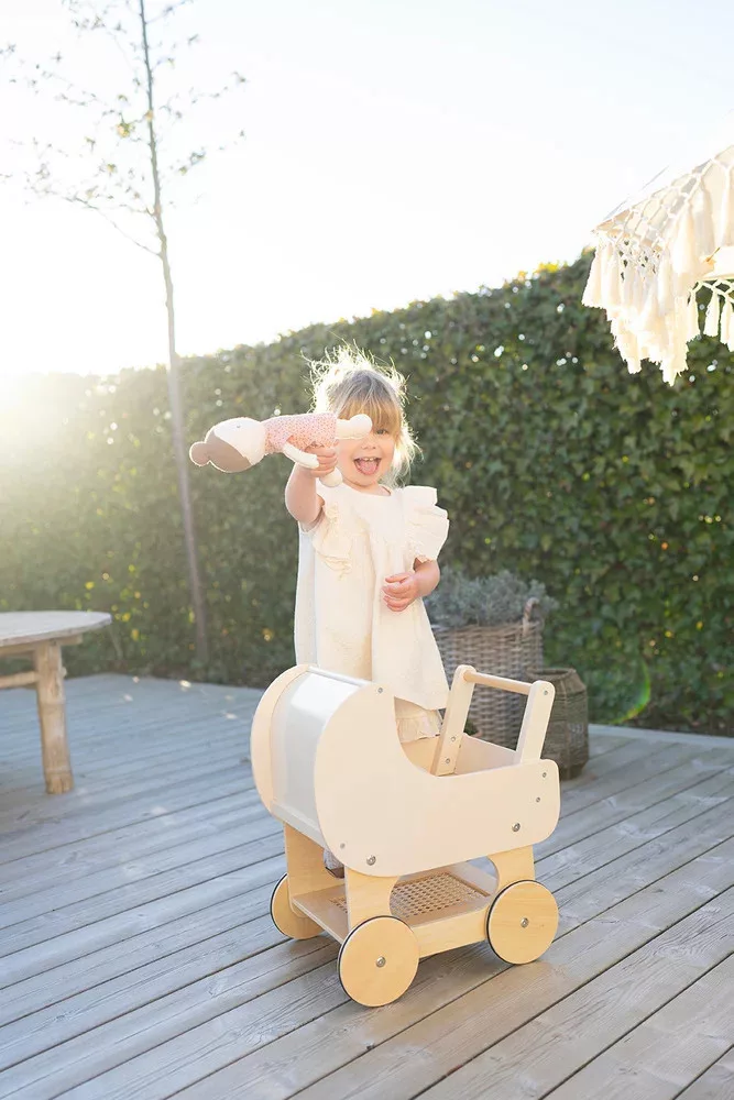 Ideje sétálni! A Jabadabado aranyos, fából készült babakocsija szép krémszínű és dekoratív, rattanszerű részletekkel rendelkezik. Ez egy klasszikus játék, amely tökéletesen illik a gyerekszobába. A babakocsi alján egy polc található, ahol szükséges kiegészítő vagy más játékok tárolhatók.