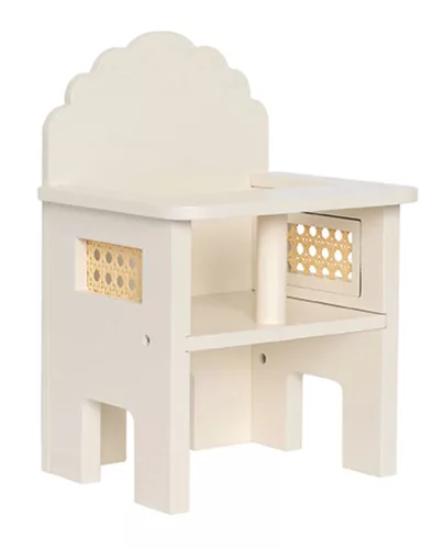 A Jabadabado aranyos, fából készült babaszéke szép krémszínű és dekoratív, rattanszerű részletekkel díszített. Klasszikus játék, amely tökéletesen illik a gyerekszobába. Helyezd a babádat vagy a plüssállatodat a székbe és készíts finom ételeket, amivel megetetheted.
