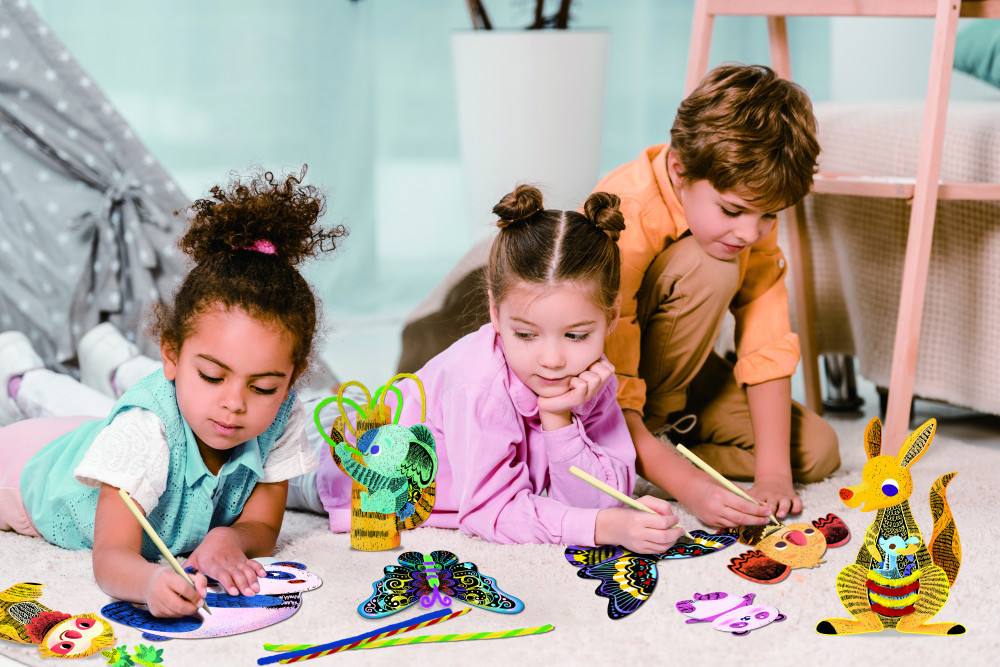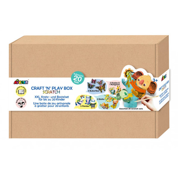 20 gyerkőc számára elegndő alapanyagot tartalmazó kreatív játékkészlet, amiben rengeteg karcolható lap, valamint zsenília rudak és karceszközök találhatók.