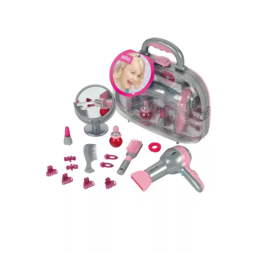 A Klein Braun Szépségszett Hajszárítóval egy nagyszerű ajándék minden kisgyermek számára, aki szívesen utánozza a felnőtteket! A készlet tartalmaz egy élethű Braun hajszárítót, fésűt, hajcsatokat, tükröt, hajgumit, valamint rúzst és parfümöt. A játék segít fejleszteni a kreativitást és a finommotorikus készségeket, miközben szórakoztató szerepjátékot biztosít. 3 éves kortól ajánlott!