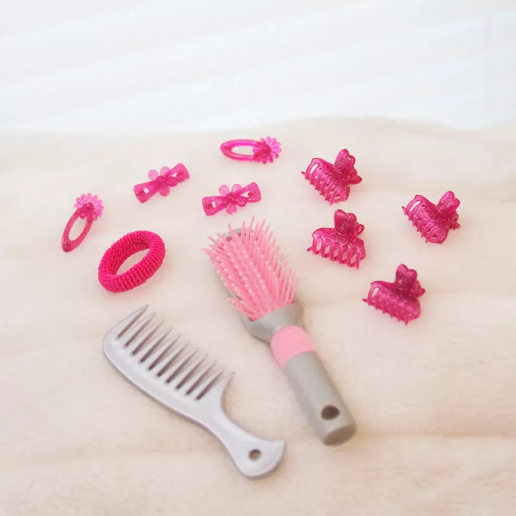 A készlet további elemei, mint a fésű, hajcsatok, hajgumi, tükör, valamint a rúzs és parfüm üvegek (díszítőelemek) segítenek a gyerekeknek kreatív frizurák készítésében. Ez a játék nemcsak szórakoztató, hanem fejleszti a finommotorikus készségeket és a képzelőerőt is, miközben a gyerekek a saját stílusukat alakítják.