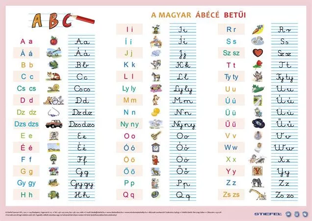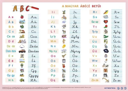 Az összes betűt (kis- és nagybetűket, ékezeteket) bemutató új tablónk készítésekor több, mint 1000 gyermeket kérdeztünk meg arról, hogy az egyes betűkről mi jut eszükbe. A rajzokkal illusztrált kiadvány hátán a vonal-elemek és az írott betűk gyakorlására van lehetőség.
