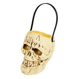 20 cm magas koponya alakú műanyag vödör, ideális cukorka vagy nassolnivaló gyűjtésére Halloween során. Tartós és látványos kellék jelmezhez vagy parti dekorációnak.