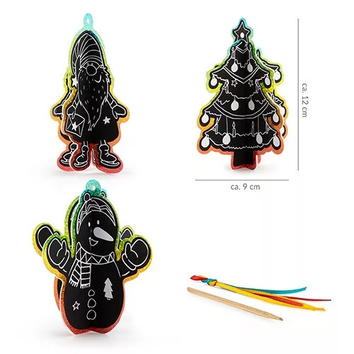 • A készlet tartalma: 3 db karcolható figura, 1 fából készült karcolóeszköz, 3 szalag a felakasztáshoz.