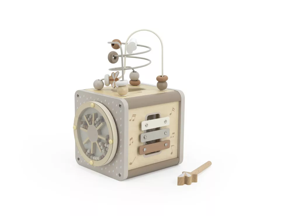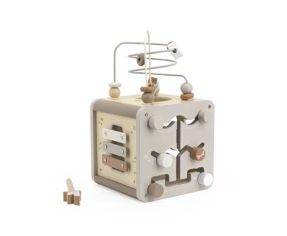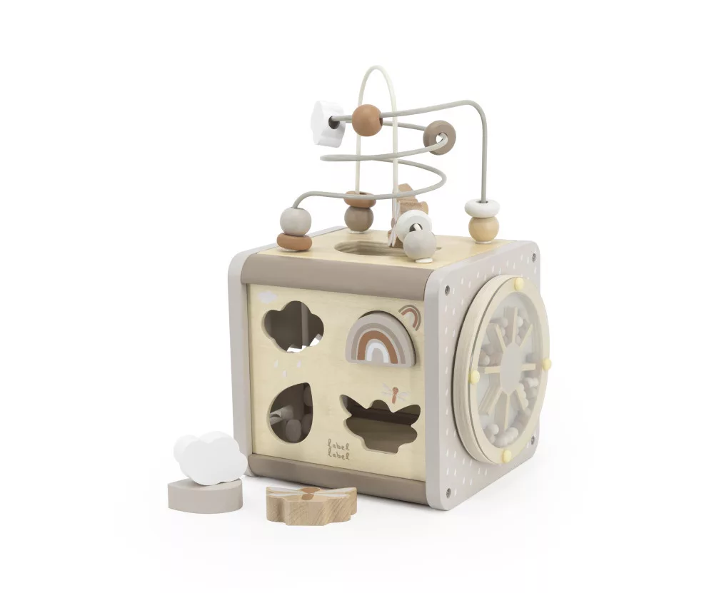 Az Label Label kellememes nugát színű tevékenység kockája egy 5 az 1-ben játék. Megtalálható benne a formaválogató, fogaskerekek, pályalabirintus, xilofon és gyöngyök labirintusa. A kicsiket mind-mind fejlesztő és szórakoztató játékra inspirálja. A golyóvezető labirintus leválasztható a kockáról, így két külön játékká válik.