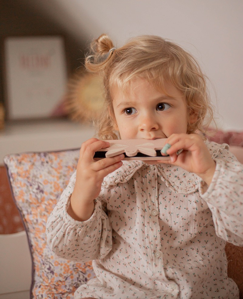 A kis zenészünk imádni fogja ennek az aranyos szitakötővel díszített rózsaszín szájharmonikának a hangját! A szájharmonika különböző lyukaira fújva különböző hangokat és hangszíneket fog tudni játszani.