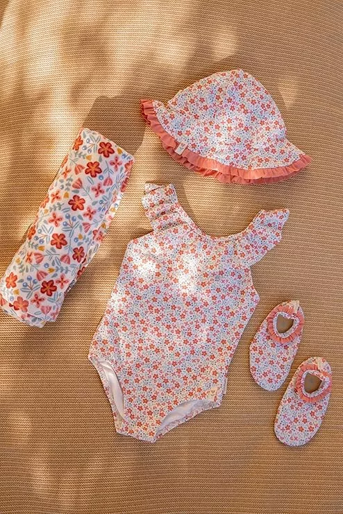Vidám, színes virágmintás babafürdőruha fodros vállpántokkal, ideális 6–12 hónapos babáknak. Gyorsan száradó, rugalmas anyagból készült, kényelmes és praktikus választás strandra, medencébe vagy pancsoláshoz. Környezetbarát, könnyen kezelhető, tökéletes nyári viselet a legkisebbeknek.