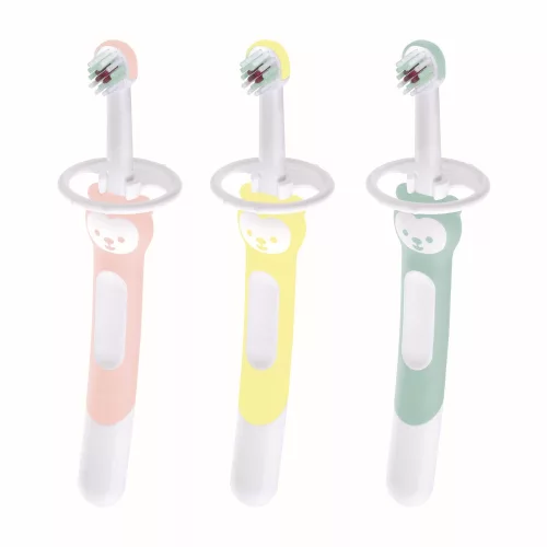 A helyes fogmosást tanulni kell.A Training Brush a fogmosást kezdettõl fogva megkönnyíti.És a mama vagy a papa segítségével még könnyebben megy.MAM Training Brush fogkefe 6 hónapos kortól ajánlott!Jellemzõi:A rövid, különösen puha, lekerekített sörtéklehetõvé teszik a lepedék gyengéd eltávolítását anélkül hogy afogzománcot megsértenénk.A nyél ergonómikus kialakítású és nem csúszik.Az extra hosszú nyélnek köszönhetõen a felnõttek iskönnyedén tudnak segíteni a babának fogmosás közben.A puha masszírozófej segítségével már az elsõ fogacskakibújása elõtt is gyengéden tisztható a baba nyelve és foghúsa. A rendelt színt a megjegyzés mezõbe kérjük feltüntetni!- Fontos! A termék egészségvédelmi és higiéniai terméknek minõsül. Amennyiben a csomagolás felbontásra került, vagy a kipróbálás jelei látszódnak a terméken, úgy a 14 napos elállási jog érvényét veszíti a 45/2014. (II. 26.) korm. rendelet 29. § (1) bekezdése alapján.