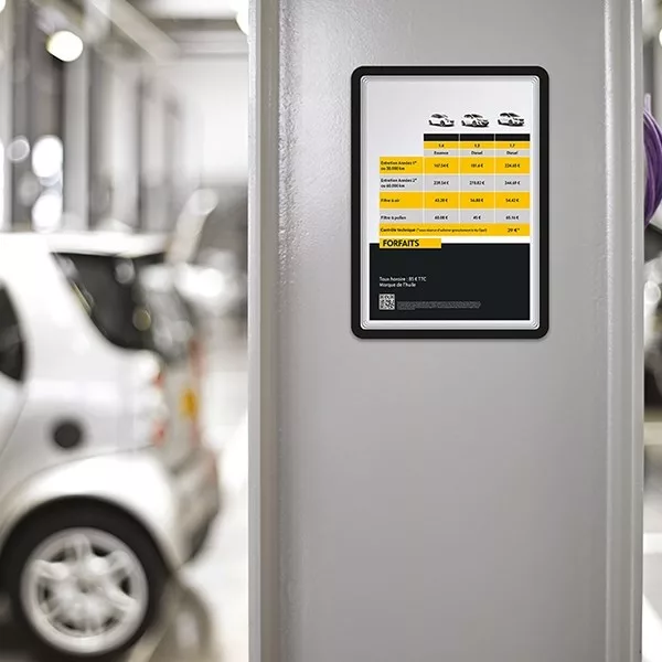 Formatervezett, mágneses hátú, tasak lekerekített sarkakkal. Egy teli mágneses hátlapból és egy előlapból álló, három oldalról nyitott tasak, melyben a dokumentum rögzítése 3 oldalon mágneses szegéllyel történik. Egyszerű és gyors kihelyezést és áthelyezést tesz lehetővé. Üzletekben, hotelekben, éttermekben, ipari üzemekben és iskolákban történő használatra egyaránt alkalmas.
