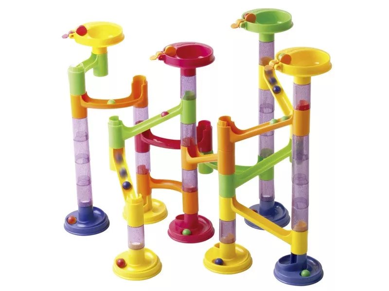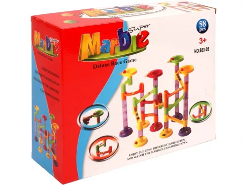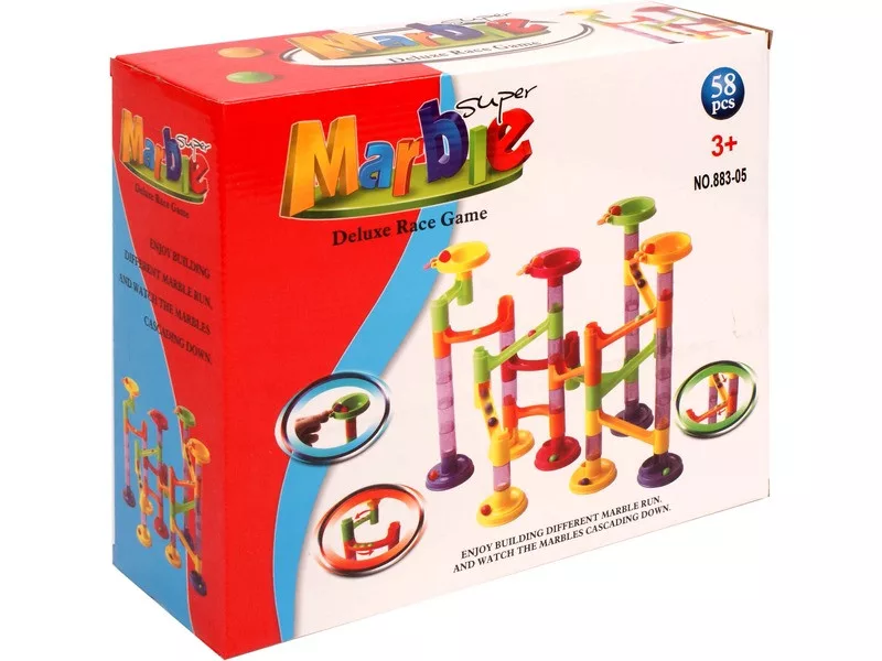 A Marble 58 darabos műanyag golyópálya15 színes golyóból és 43 alkatrészből áll, amikből egy több emeletes és oszlopos, magas pályát tudsz összerakni. A golyókat a pálya tetejéről kell indítanod, és a lejtőkön, csövekben haladva végül a pálya alján fognak kikötni! A pálya összerakása nagy mértékben fejleszti a térlátást és a kézügyességet is, némi gyakorlással már kifejezetten bonyolult pályákat is össze fogtok tudni rakni! A Marble 58 darabos műanyag golyópálya csomagolási méretei: 29 x 10 x 25 cm.