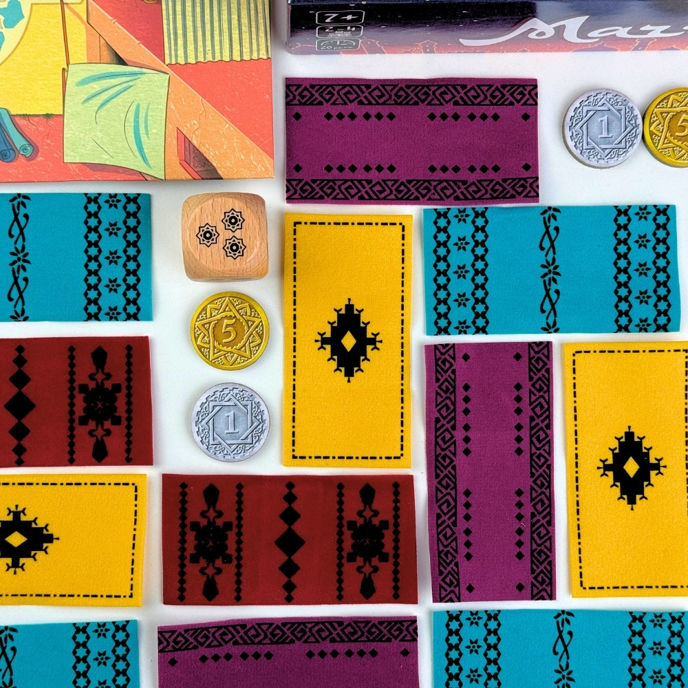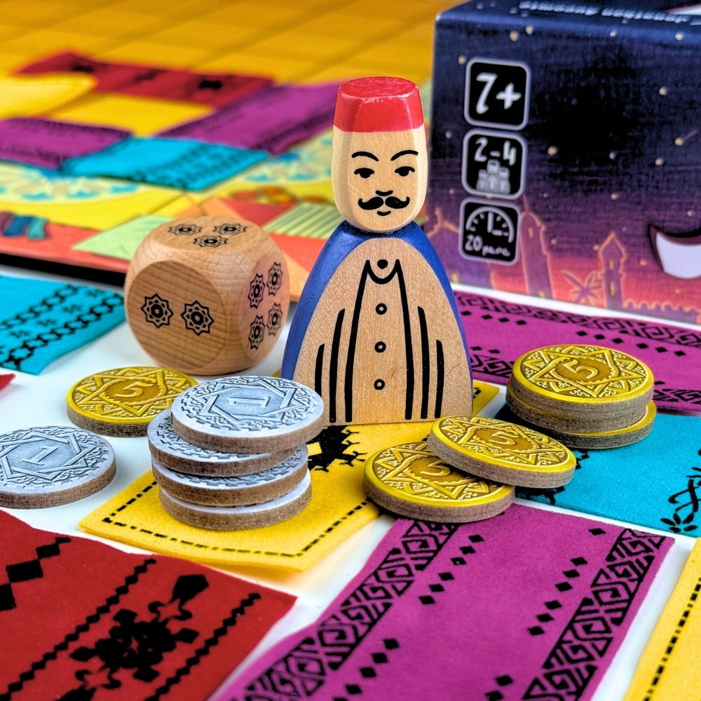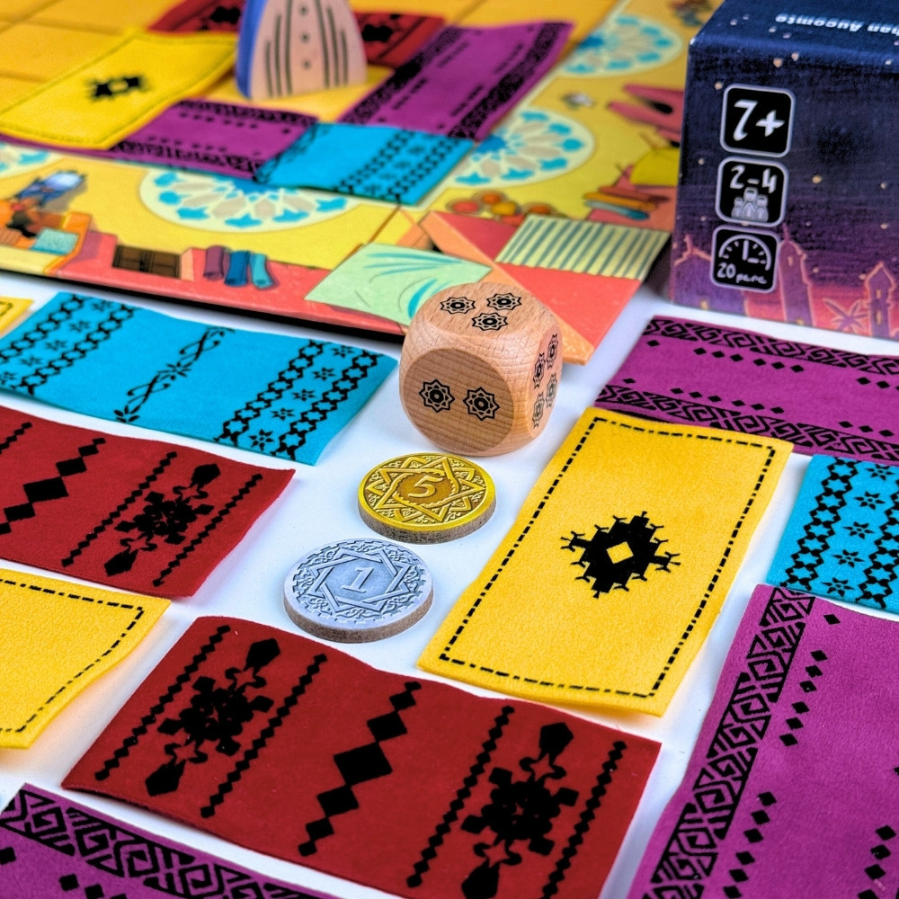 A játék alkatrészei önmagukban is élményszámba mennek: a kis textil szőnyegek tapintása és a fa Assam figura azonnal beszippant a marokkói bazár hangulatába. Egyszerű szabályai miatt már 7 éves kortól remek szórakozás a családnak, de a taktikai lehetőségek a tapasztaltabb játékosokat is lázban tartják.