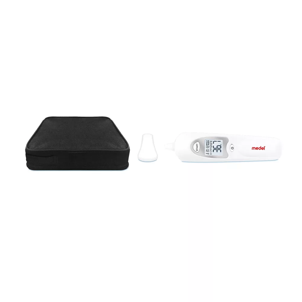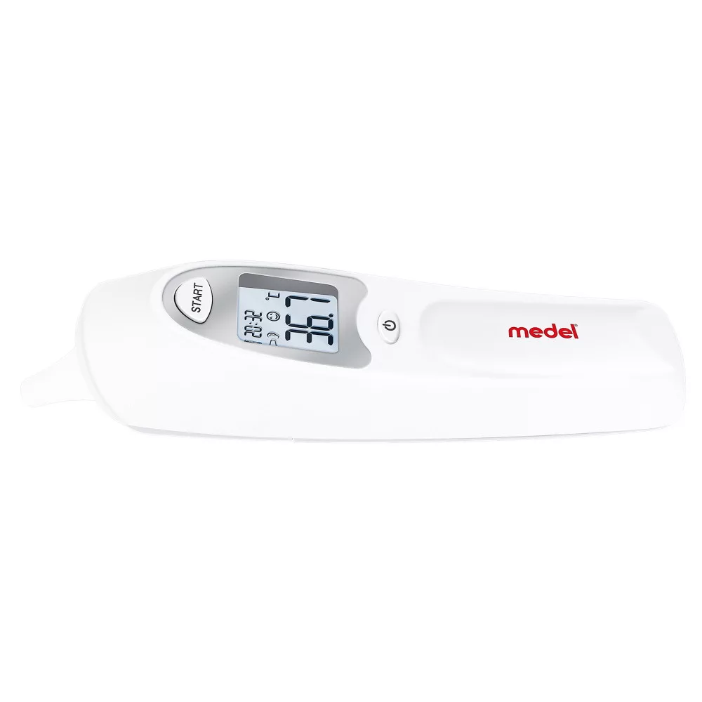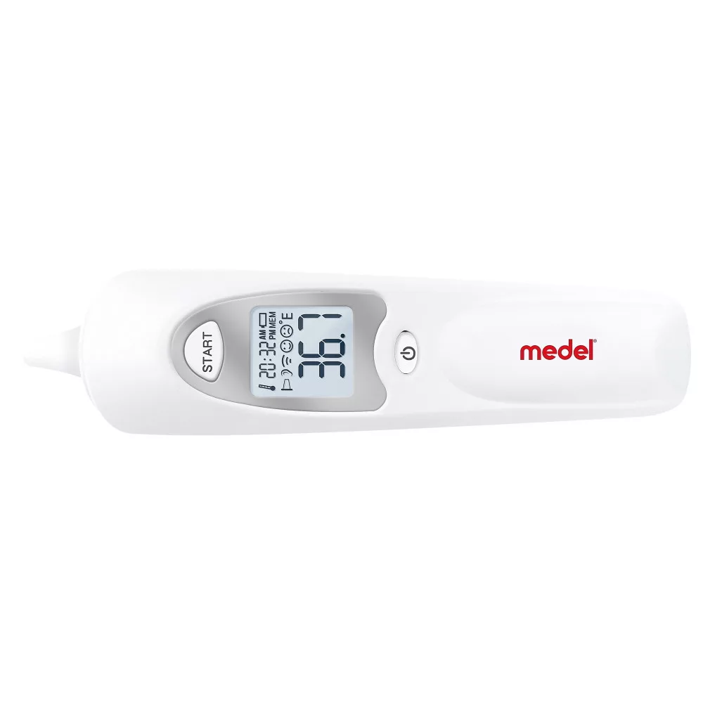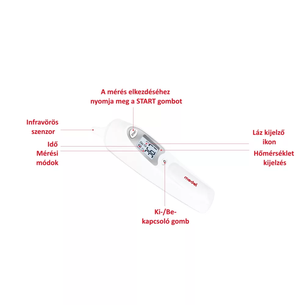 Rendkívül gyors mérés = 1 másodperc- többfunkciós;- Jelzés hõemelkedés és riasztás láz esetén- Memória: 10 mérés- Jelzés lemerülõ elem esetén- Automatikus kikapcsolás- nagyméretû LCD kijelzõA Medel EAR TEMP egy infravörös technológiás fülhõmérõ, amely biztonságosan, gyorsan és nem invazív módon képes észlelni gyermekek és felnõttek testhõmérsékletét a fülben mérve. A Medel fülhõmérõ csomagában 15 védõkupak található a higiénikusabb és biztonságosabb lázmérés érdekében. Néhány másodperc alatt érzékeli a hõmérsékletet a mérés végén hangjelzéssel. Más hangjelzéssel jelzi a hõemelkedést és a lázat (ha eléri a 38 °C-ot). A 38 °C-os és afeletti testhõt szomorú ikonnal, az alattit mosolygós ikonnal is jelzi.-Alkalmas tárgyak felületi hõmérsékletének megmérésére, illetve a környezet (szoba) hõmérsékletének mérésére is.-Tárolja az utolsó 10 mérés eredményét dátummal és idõvel együtt.-Automatikusan kikapcsol, ha nem használjuk 1 percig.-Jelzi az alacsony elemfeszültséget.-Átállítható °F mértékegységre.Mûszaki jellemzõk:Hõmérés pontossága fülben: plusz/mínusz 0,2 °CFelületi hõmérés pontossága: plusz/mínusz 4% vagy plusz/mínusz 2 °CKörnyezeti hõmérés pontossága: plusz/mínusz 2 °CA fülben mérés tartománya: 28–43 °CFelületi mérési tartomány: -20 – 100 °CKörnyezeti mérési tartomány: 0–50 °CMûködési tartomány: 10 - 40 °CTápegység: 2 alkáli AAA 1,5VA mérés idõtartama: körülbelül 1 másodpercMemória: 10 memóriahelyMérete: 15,5 x 3,8 x 4,7 cmSúlya: 63 g (elemek nélkül)A Medel fülhõmérõ csomagolásának tartalma: Hõmérõ, 15 védõkupak, elemek és tárolótáska.Olvassa el figyelmesen az utasításokat.- Fontos! A termék egészségvédelmi és higiéniai terméknek minõsül. Amennyiben a csomagolás felbontásra került, vagy a kipróbálás jelei látszódnak a terméken, úgy a 14 napos elállási jog érvényét veszíti a 45/2014. (II. 26.) korm. rendelet 29. § (1) bekezdése alapján.