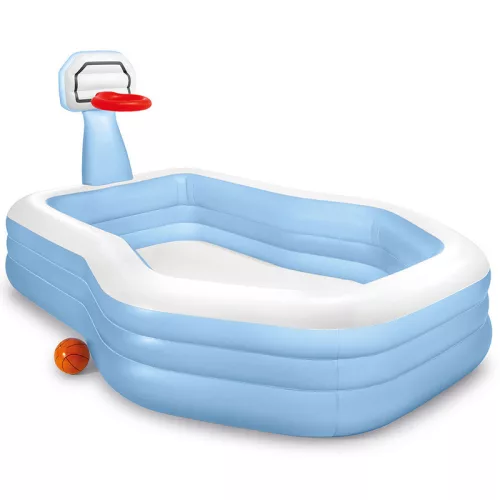Családi medence, kosárlabda palánkkal, gyűrűvel és labdával.
