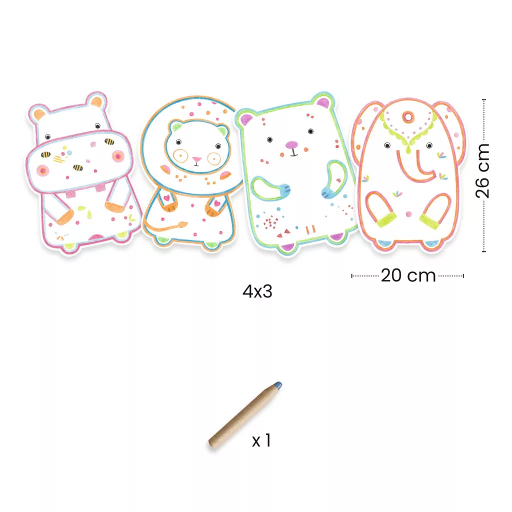 Egy 12 képből álló állatképes sorozat amelyek egy nagy színes ceruzával színezhetőek. A képek állatfigura alakúak, a ceruza elég nagy, hogy  a kicsi kezecskék biztonsággal foghassák. A képeken csak az előre elrendezett képrészleteket színezi ki a készlethez tartozó színesceruza, így ha ki is szalad a színezés a körvonalból, nem hagy nyomot. A gyermek a varázsceruzával színez, és előtűnnek az addig rejtett erdei állatos képek! A varázslatos ceruza csak a tervezett területeken jelöl meg, és láthatatlan elemeket tár fel, igazi meglepetés vonalról-vonalra, képről-képre!